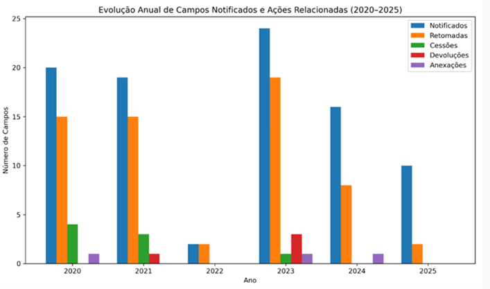 É importante destacar que 15 dos campos notificados entre 2024 e 2025 ainda estão dentro do prazo regulamentar para a adoção de medidas pelas empresas, conforme previsto nas Resoluções CNPE n° 2/2016 e n° 5/2022 e no Parágrafo 29.4 da cláusula vigésima nona do contrato de concessão. A ANP segue monitorando esses casos, avaliando cronogramas para a retomada da produção, propostas de cessão e eventuais devoluções.