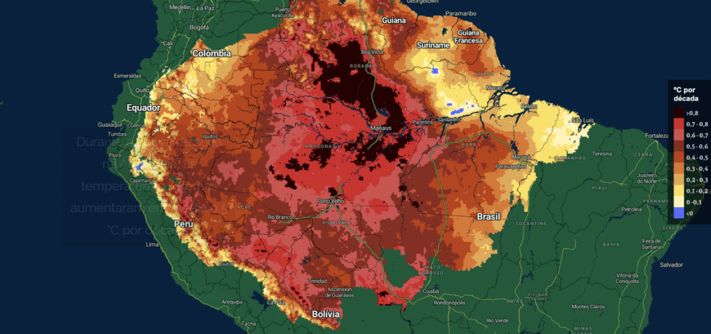 A pesquisa, realizada por cientistas da Universidade de Lancaster, Instituto Nacional de Pesquisas Espaciais (Inpe), Embrapa e uma equipe internacional de especialistas de 29 instituições, com apoio da WWF Reino Unido, avaliou dados de alta resolução de temperatura e chuva obtidos por satélites em toda a bacia Amazônia e modelou as mudanças de temperatura e estresse hídrico na região no período de 1981 a 2023. O trabalho revelou que 10% da bacia apresenta aumentos de temperaturas extremas de pelo menos 0,77 °C por década e mais de 3,31 °C. Esse número é, pelo menos, três vezes maior que os aumentos médios de temperatura na Amazônia de 0,21 °C por década.