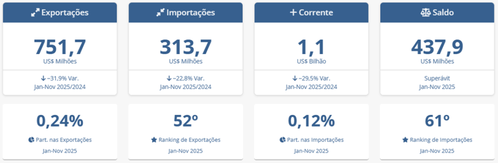 A partir de 2013, entretanto, observou-se uma redução significativa do comércio bilateral, culminando em mínimos históricos entre 2019 e 2020, especialmente nas importações brasileiras, que caíram para apenas US$ 76 milhões em 2020.