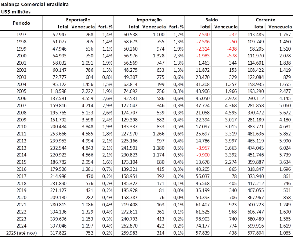 O comércio bilateral entre Brasil e Venezuela apresentou fortes variações entre 1997 e 2025, com picos históricos no início dos anos 2000 e declínio acentuado a partir de 2013.