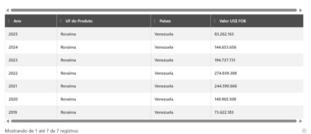 Dados recentes da balança comercial fornecidos pela FIERR reforçam a endência de queda nas exportações de Roraima para a Venezuela no segmento. As exportações totais do estado em novembro de 2025 somaram US$ 35,05 milhões, uma queda de 30,73% em relação a outubro (US$ 50,60 milhões), mas com alta de 84,71% no comparativo anual frente a novembro de 2024 (US$ 18,98 milhões).