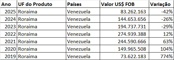 Dados fornecidos pela FecomércioRR apontam que desde 2023 as exportações roraimenses para a Venezuela vem caindo significativamente, chegando a -42% no anos de 2025 com um total de U$$ 83.262.163. Em 2024 o total de exportações chegou a U$$ 144.563.656, uma queda de 26% em relação a 2023, que ficou em U$$ 194.737.731.