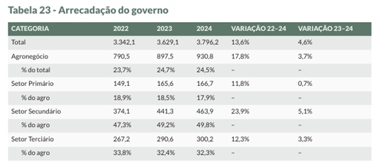 A arrecadação total do governo apresentou crescimento consistente entre 2022 e 2024, passando de R$ 3,34 trilhões para R$ 3,80 trilhões, um avanço acumulado de 13,6%. O agronegócio teve um desempenho ainda mais expressivo, com crescimento de 17,8% no mesmo período, representando cerca de 24,5% da arrecadação nacional em 2024. No mesmo ano, segundo a análise do IBPT, o orçamento total destinado ao Bolsa Família foi de R$ 169,7 bilhões e, portanto, a arrecadação proveniente do agro seria suficiente para custear integralmente o programa.
