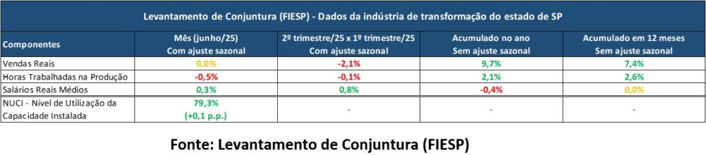 Segundo a pesquisa Levantamento de Conjuntura (Fiesp), os destaques no mês de junho, no setor industrial paulista, foram os salários reais médios, com crescimento de 0,3% no período. Outro componente acompanhado com variação positiva foi o NUCI, que passou de 79,2% em maio para 79,3% (+0,1 p.p.) na leitura atual.