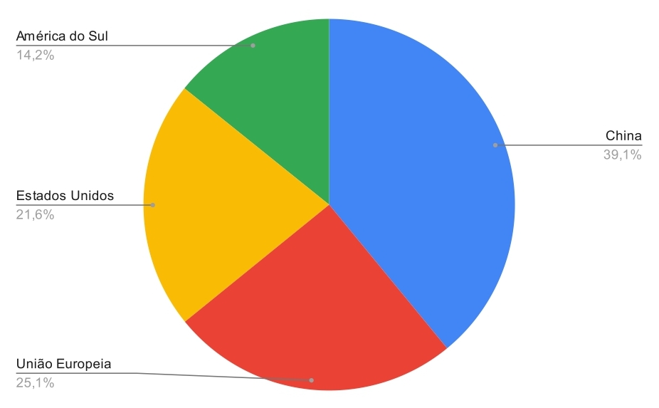 A União Europeia com menos 44% e a América do Sul, menos 31%, também perderam espaço para o gigante asiático no intervalo de 23 anos. Mesmo com esses dois grupos de países perdendo participação, ainda ficam na frente dos Estados Unidos.