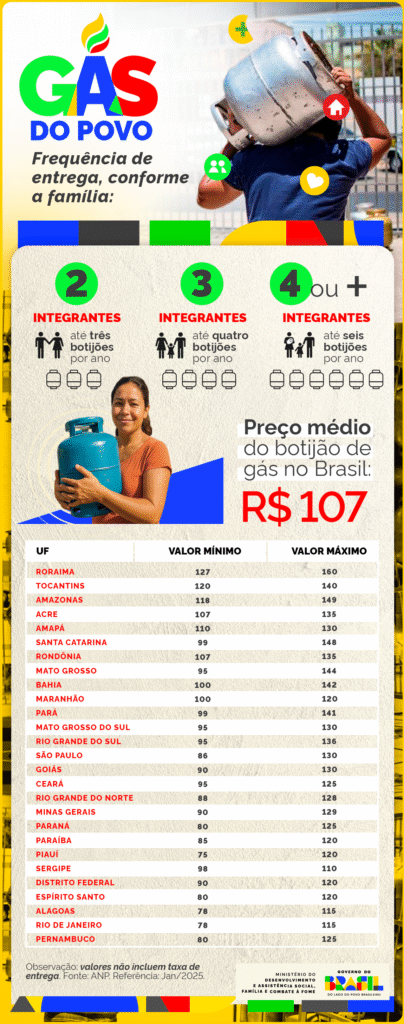 Criado para ampliar e fortalecer o acesso ao gás de cozinha no Brasil, o programa substitui o Auxílio Gás dos Brasileiros (Lei nº 14.237/2021), garantindo mais justiça social, saúde e dignidade às famílias de baixa renda, assegurando o acesso gratuito a um item essencial. Terão direito ao benefício famílias inscritas no Cadastro Único, com renda per capita de até meio salário mínimo (R$ 759), com prioridade para aquelas que recebem o Bolsa Família (renda per capita de até R$ 218).