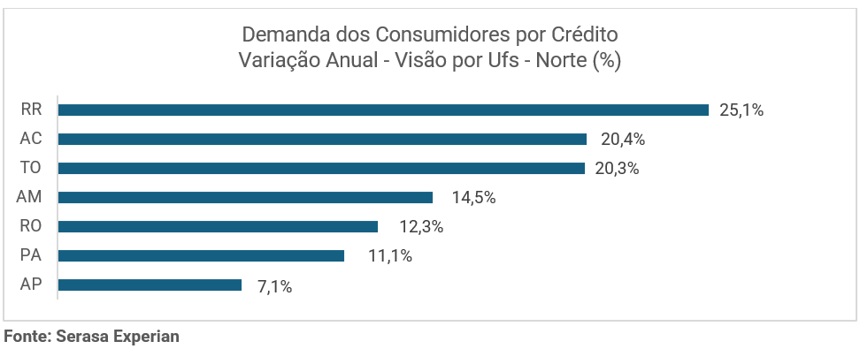 A procura dos brasileiros por recursos financeiros avançou em todas as Unidades Federativas (UFs) do Norte em setembro de 2025, na variação anual, segundo o Indicador de Demanda dos Consumidores por Crédito da Serasa Experian, primeira e maior datatech do Brasil. O destaque ficou com Roraima (25,1%), Acre (20,4%) e Tocantins (20,3%). Já os menores crescimentos foram em Amazonas (14,5%), Rondônia (12,3%), Pará (11,1%) e Amapá (7,1%). Confira no gráfico a seguir a variação anual por estado: