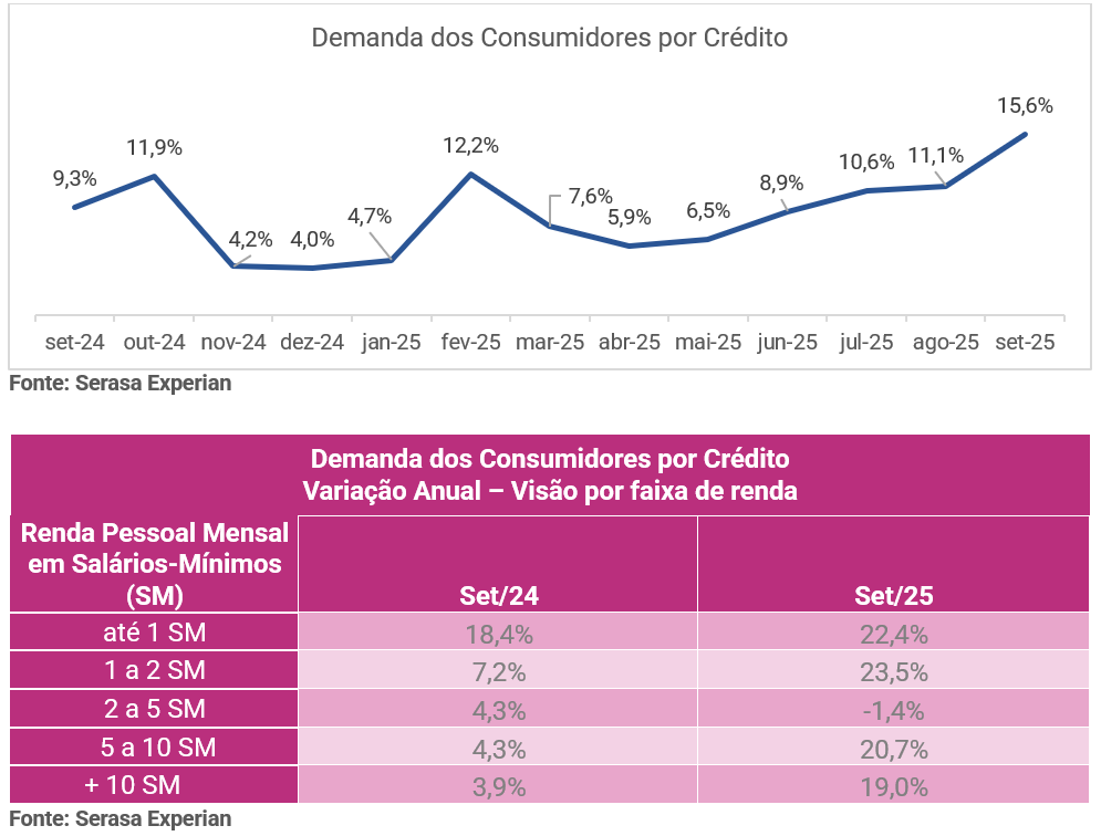 Nacionalmente, a busca dos consumidores por recursos financeiros avançou 15,6% em setembro de 2025, na comparação anual. O resultado mostra uma alta de 6,3 pontos percentuais frente ao mesmo período do ano anterior, refletindo um ambiente econômico no qual a procura pelo crédito segue aquecida, mesmo com o encarecimento devido ao patamar elevado da taxa Selic, atualmente em 15% ao ano.