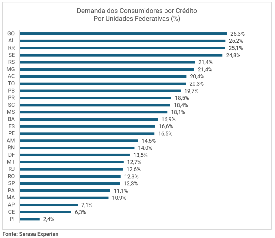 A análise regional mostra que o avanço da demanda por crédito foi disseminado em todo o país em setembro de 2025, ainda que com intensidades distintas entre os estados. As maiores expansões ocorreram principalmente no Centro-Oeste e no Nordeste, impulsionadas por unidades federativas como Goiás (25,3%), Alagoas (25,2%) e Sergipe (24,8%), que lideraram a busca por crédito. No Norte, o movimento também foi significativo, com destaque para Roraima (25,1%) e Tocantins (20,3%), enquanto no Sudeste e no Sul o crescimento apareceu de forma mais homogênea, embora em patamar moderado, com avanços relevantes em Minas Gerais (21,4%), Rio Grande do Sul (21,4%) e Paraná (18,5%). Na outra ponta, estados como Piauí (2,4%), Amapá (7,1%) e Ceará (6,3%) registraram as menores variações. Confira a visão de demanda por UF no gráfico abaixo: