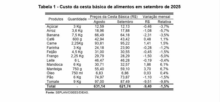 De acordo com os resultados de setembro, o custo da cesta básica de alimentos na cidade foi, em média, de R$ 621,74, refletindo uma redução de 1,5%, ou R$ 9,40, em relação ao mês anterior. Entre os produtos, a manteiga teve a maior alta no período, com um aumento de 6,7%. Por outro lado, os preços do tomate, arroz e frango apresentaram as maiores quedas, com -9,8%, -5,7% e -5,0%, respectivamente.