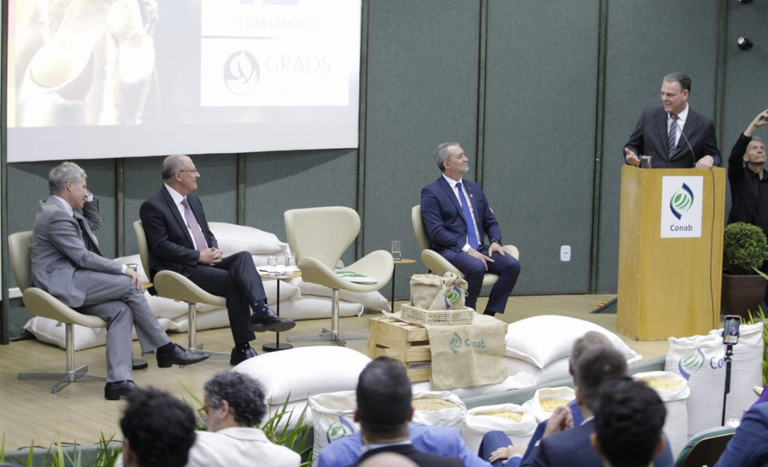 O ministro da Agricultura e Pecuária, Carlos Fávaro e o vice-presidente e ministro do Desenvolvimento, Indústria, Comércio e Serviços, Geraldo Alckmin, participaram do anúncio do 12º Levantamento da Safra de Grãos 2024/2025 realizado pela Companhia Nacional de Abastecimento (Conab).