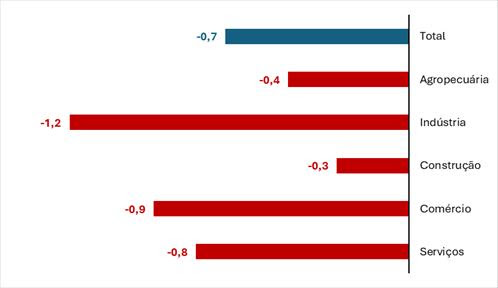 Depois da indústria, com queda de 1,2%, o setor mais impactado será o do comércio (-0,9%, equivalente a R$ 11,1 bilhões). Na sequência, aparecem os setores de serviços (-0,8%, o equivalente a R$ 43,5 bilhões), a agropecuária (-0,4%, cerca de R$ 2,3 bilhões) e o setor de construção (-0,3%, R$ equivalente a 921,8 milhões).