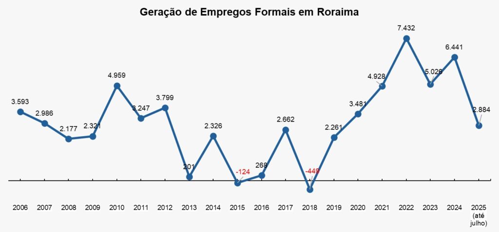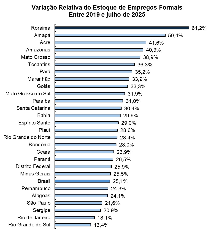 No acumulado entre 2019 e julho de 2025, foram criados 32.453 novos empregos formais, representando um crescimento expressivo de 61% no estoque total de trabalhadores. O resultado coloca Roraima no topo do ranking nacional de crescimento proporcional na geração de empregos formais.