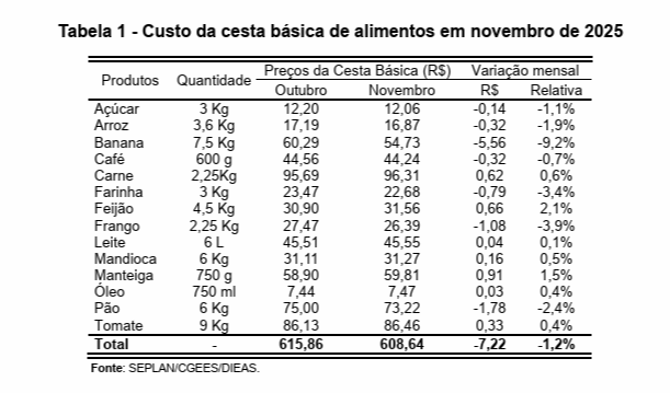 Em novembro de 2025, a cidade de Boa Vista registrou uma queda de 1,2% no custo da cesta básica de alimentos, segundo dados da Secretaria de Planejamento e Gestão (SEPLAN). O custo médio para aquisição da cesta foi de R$ 608,64, resultando em uma diminuição de R$ 7,22 em relação ao mês anterior.