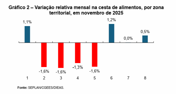 Além disso, a análise por zonas da cidade mostra que três delas apresentaram aumentos em seus preços na comparação com outubro: a zona 6, com 1,2%; a zona 1, com 1,1%; e a zona 8, com 0,5%. Os itens que mais contribuíram para esses aumentos incluíram leite, açúcar e mandioca em suas respectivas zonas.