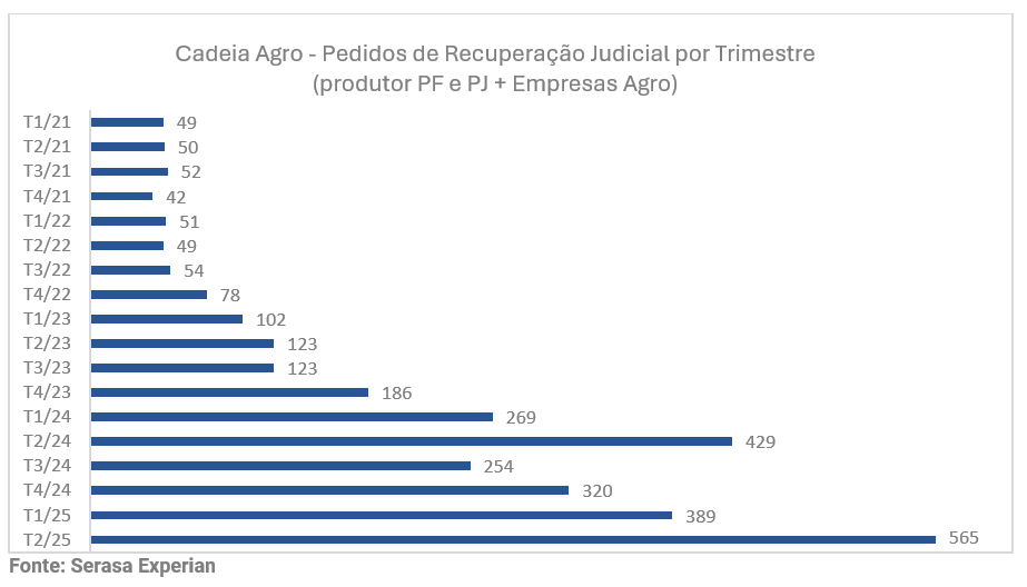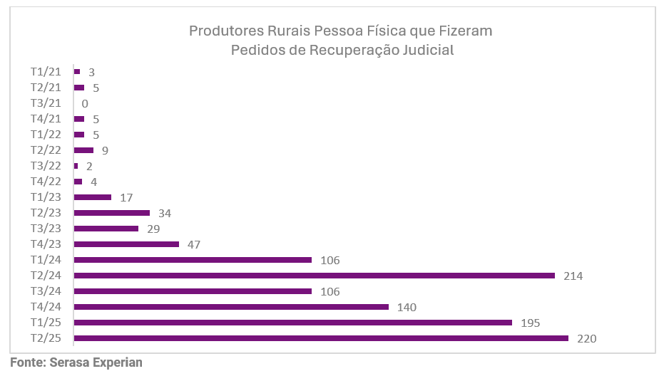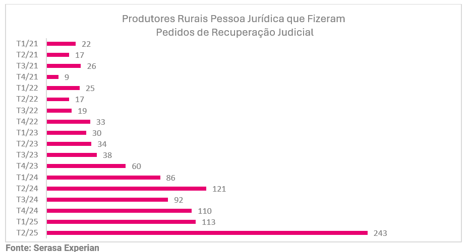Os produtores rurais que trabalham com perfil de pessoa jurídica foram os que mais optaram pela recuperação judicial no segundo trimestre de 2025, marcando 243 requisições. Em comparação trimestral com 2024 houve alta, já que o período registrava 121 pedidos. Confira no gráfico a seguir: