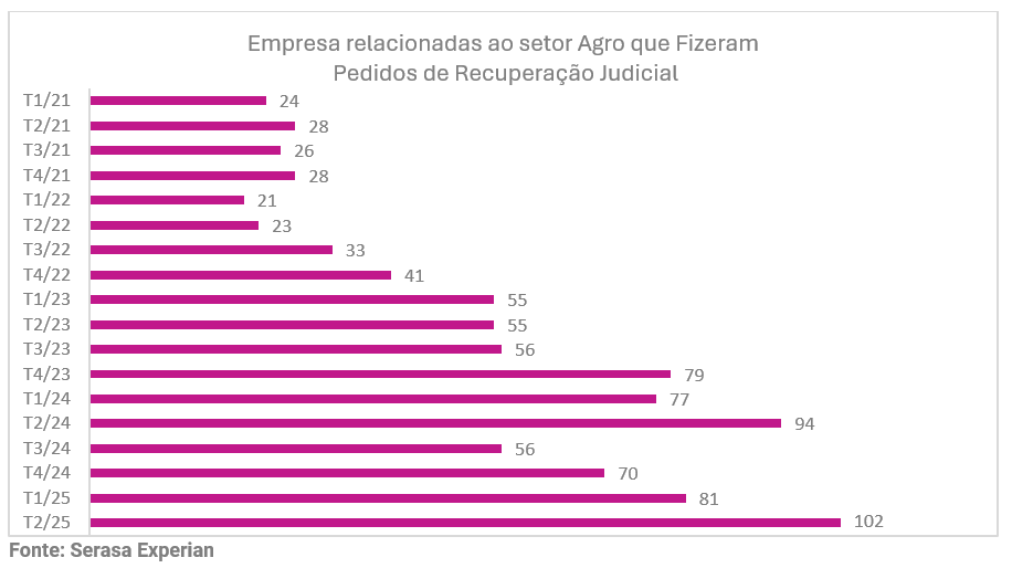 As empresas ligadas ao agronegócio registraram 102 pedidos de Recuperação Judicial no segundo trimestre de 2025. O volume é o mais alto da série recente e representa uma aceleração relevante em relação ao mesmo período de 2024, quando haviam sido feitos 94 requerimentos. Confira a movimento trimestral do setor no gráfico:
