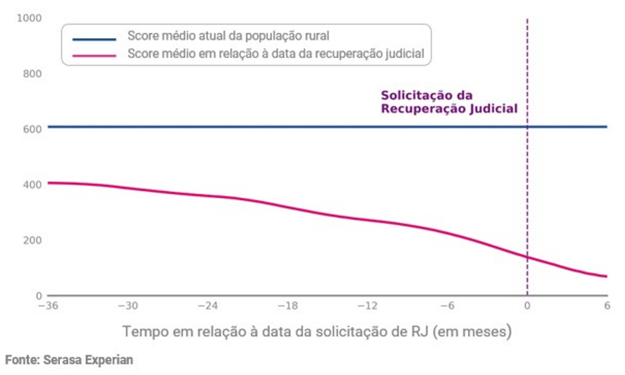 Na prática, trata-se de uma ferramenta que ajuda a reduzir as incertezas na concessão de crédito. Através de um levantamento realizado constatou-se que era possível verificar, três anos antes do ingresso do protocolo do pedido de Recuperação Judicial, que o Agro Score médio dos produtores rurais, pessoas físicas se mantinha consideravelmente superior ao daqueles que ingressaram com a referida medida judicial. Veja no gráfico: